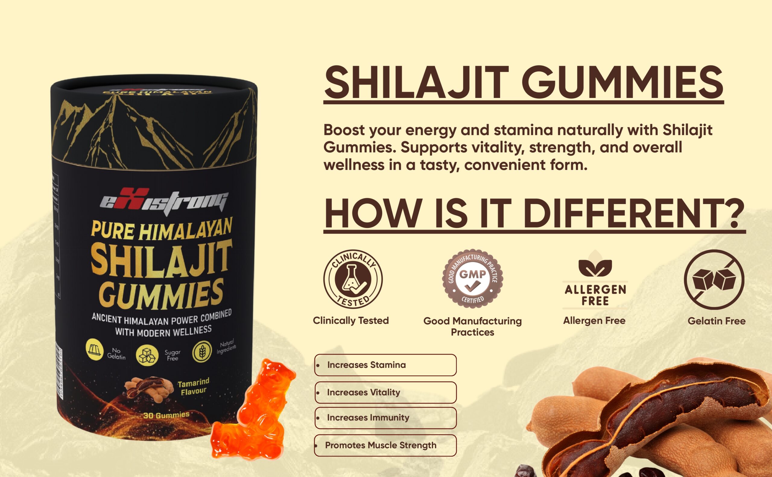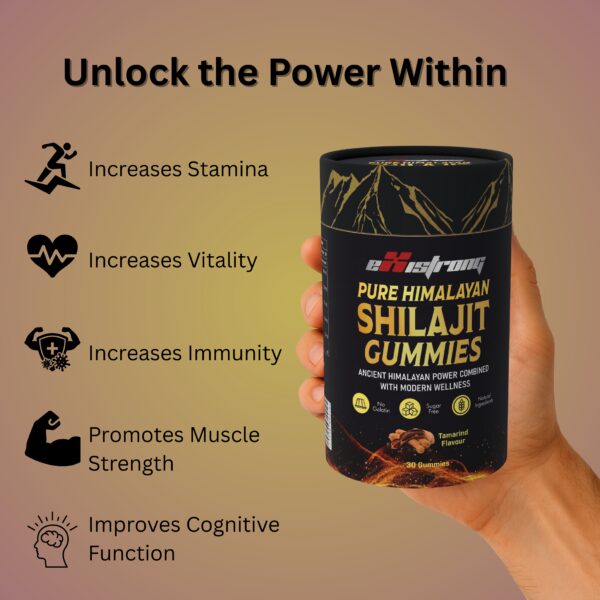 Unlock your natural energy and stamina with Existrong Pure Himalayan Shilajit Gummies. Made with authentic Himalayan Shilajit, these gummies are crafted to support vitality, immunity, and muscle strength in a convenient and delicious tamarind flavour.