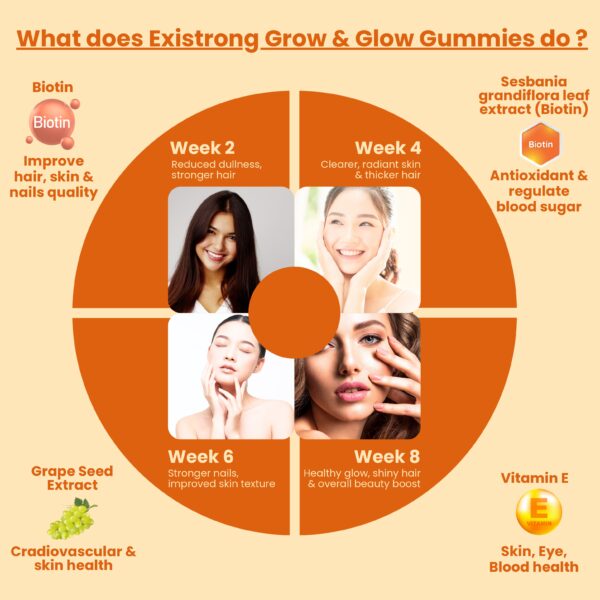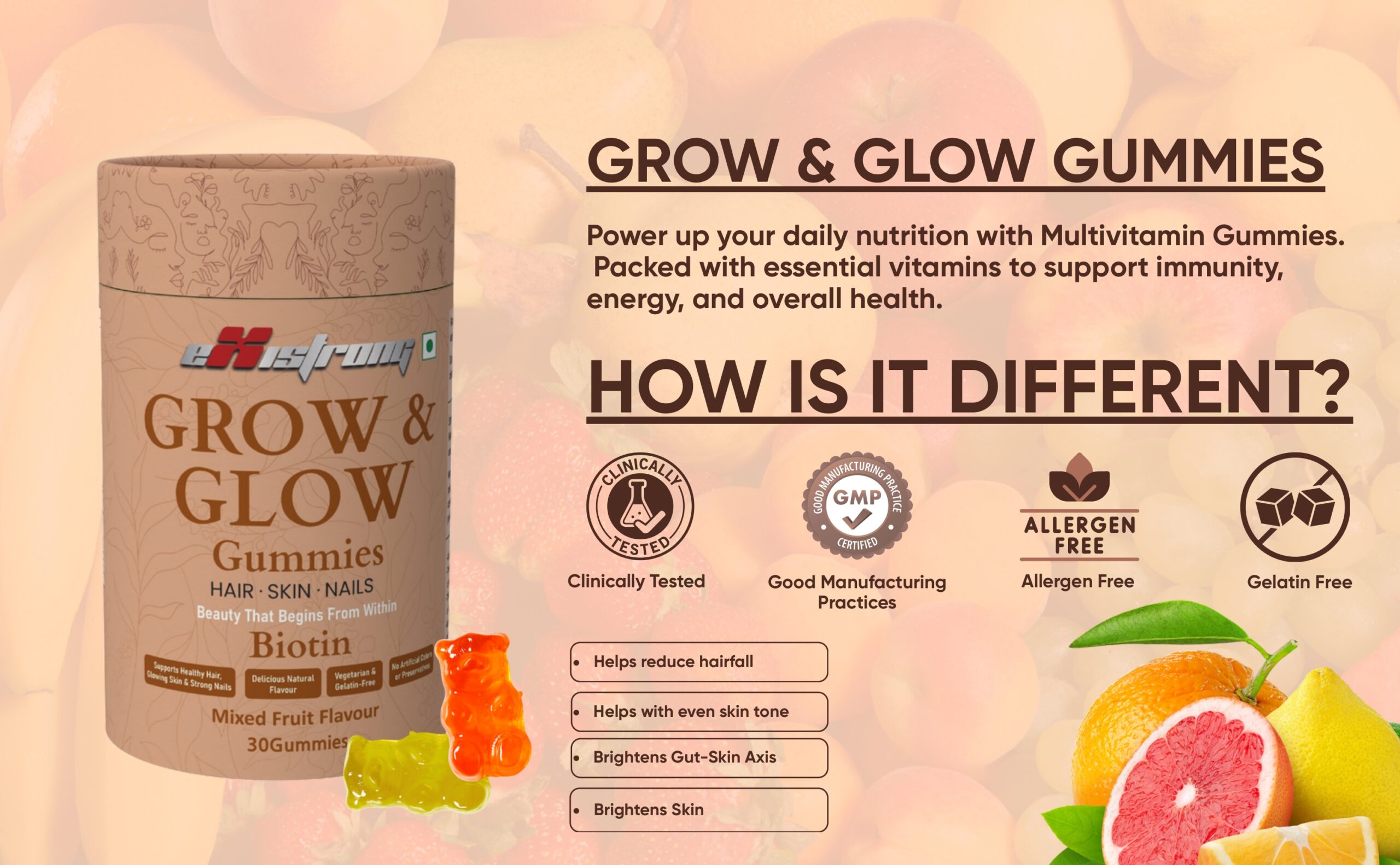Unlock the power within with Existstrong Grow & Glow Gummies – a premium blend formulated to support healthy hair, glowing skin, and strong nails from within. Each gummy is enriched with Biotin and other essential nutrients that promote hair strength, reduce hairfall, and improve skin tone. With a delicious mixed fruit flavour, these vegetarian and gluten-free gummies make daily beauty nutrition easy and enjoyable.