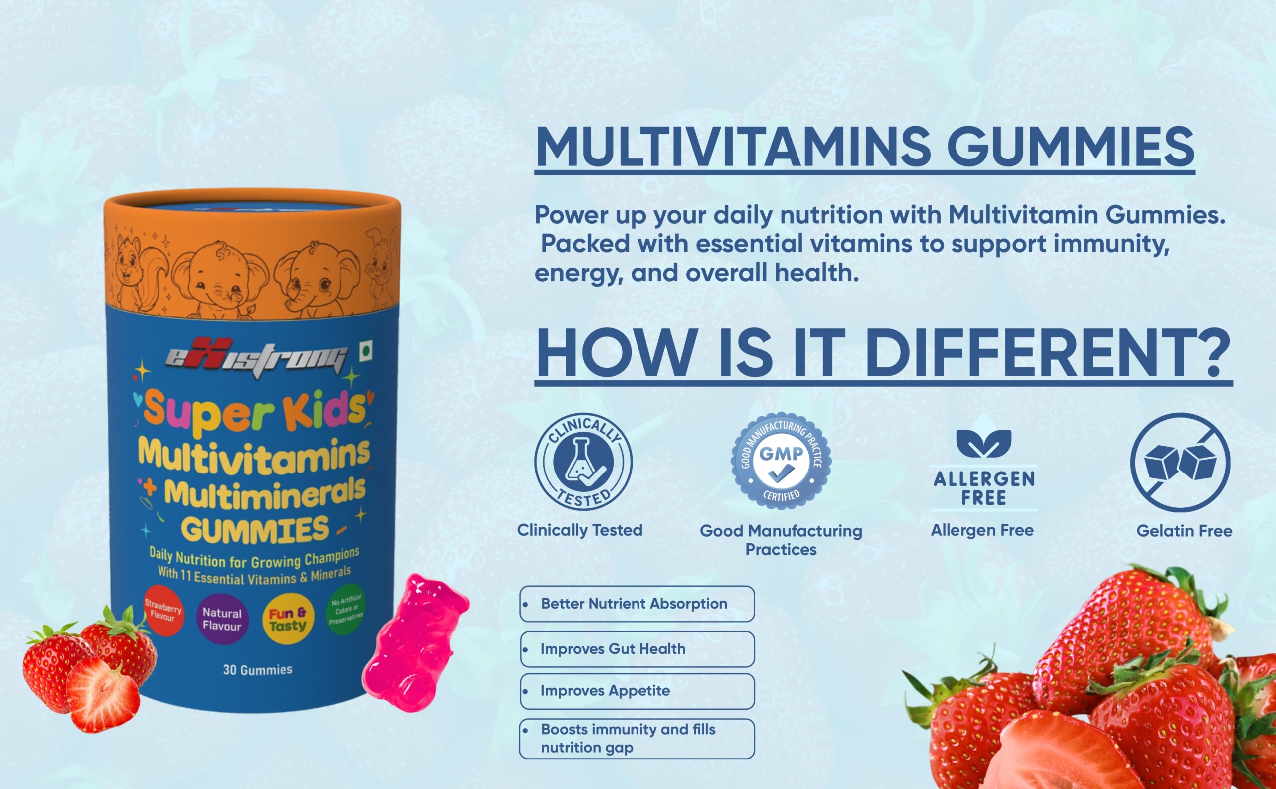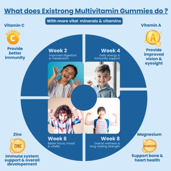 Help your kids unlock their full potential with Existstrong Super Kids Multivitamins + Multiminerals Gummies. Specially designed for growing champions, each gummy delivers 11 essential vitamins and minerals to support better nutrient absorption, improved gut health, and a stronger immune system. These fun and tasty strawberry-flavoured gummies make daily nutrition easy and enjoyable, filling the nutritional gaps in your child’s diet without artificial preservatives.